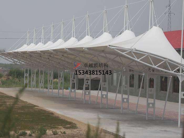車棚是一種古老的建筑形式,自有史以來就被用來作為房屋和簡易的遮蔽物。如今隨著建筑技術(shù),計算機(jī)技術(shù)和新材料研究的飛速發(fā)展,性能優(yōu)良的新型膜材被用于建造永久性的車棚結(jié)構(gòu),即膜結(jié)構(gòu)車棚,這種結(jié)構(gòu)的車棚一般由索和膜材這些柔性材料張拉而成。